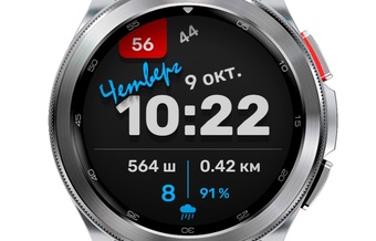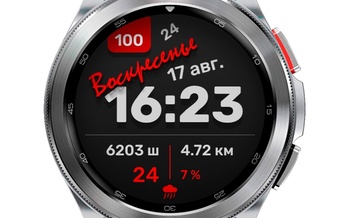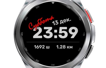 Циферблат с крупной индикацией времени. Часы, минуты, секунды, уровень заряда (на красной подложке), день недели (только русский язык), число, месяц, количество пройденных шагов и километров, температура воздуха и вероятность осадков. Семь вариантов цвета. Тап-зон нет. AOD есть.