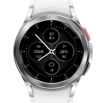 Аналоговый циферблат со всем необходимым. Часы, минуты, секунды (выполнены в виде появляющихся по окружности индексов. Верхний манеж: уровень заряда с двумя индикациями шкал прогресса и цифровой индикацией + тап-зона параметров аккумулятора. Левый манеж: пульс, шагомер, пройденное расстояние (км) + тап-зона параметров пульса. Правый манеж: число, месяц, день недели (мультиязык) + 24-часовая шкала прогресса и тап-зона календаря. Нижний манеж: погодный виджет, температура воздуха, шкала вероятности осадков. Девять цветов. Полный экран AOD.