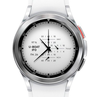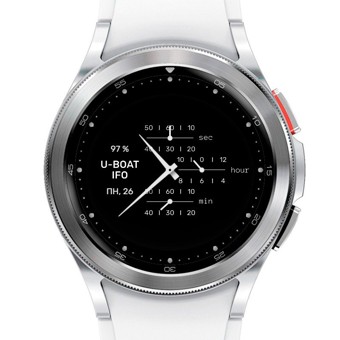 Это почти копия циферблата U-BOAT IFO. Почти потому, что на циферблат добавлен уровень заряда, число и день недели. Главная секундная стрелка имеет механический ход, а маленькая кварцевый. Цветовых схем нет. AOD полный. Тап-зона календаря в центре.
