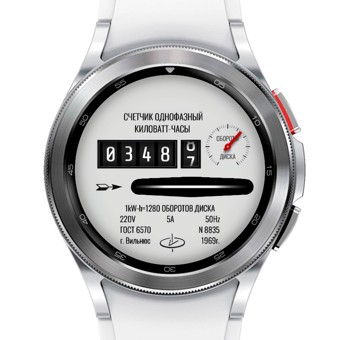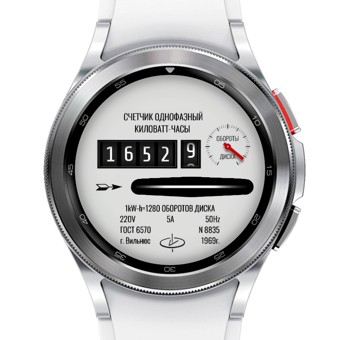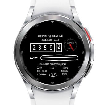 Электрический счётчик "два в одном" в чёрном и белом исполнении. Анимация диска присутствует, как и анимация секундного барабана, который имеет градацию от 0 до 9 и делает один оборот (сверху вниз) за минуту. Красная стрелка справа показывает уровень заряда. Тап-зон нет. Полный экран AOD (последний скрин).