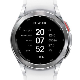 Ничего лишнего! Часы (12/24), минуты, секунды, день недели, число, месяц (мультиязык), температура воздуха, калории, шагомер, пройденное расстояние (км), пульс, уровень заряда. Циферблат даёт возможность скрыть информацию по краям, сверху или вообще всё, кроме времени. Шрифт статичный, то есть не смещается в сторону при смене нуля на единицу, например. Восемь цветов и четыре тап-зоны (календарь, будильник, параметры пульса и аккумулятора). Экран AOD есть.