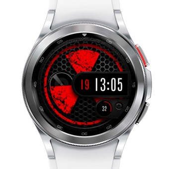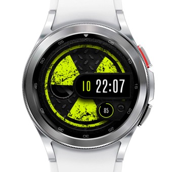 Плавное вращение эмблемы радиации по часовой стрелке (один оборот в минуту), пять сменных фонов, десять цветов. Реалистичные тени. Анимированный маятник слева, на нижнем слое. Часы (12/24), минуты, секунды, уровень заряда (цифровая индикация + шкала прогресса). Тап зоны - календарь и параметры аккумулятора. Экран AOD есть.