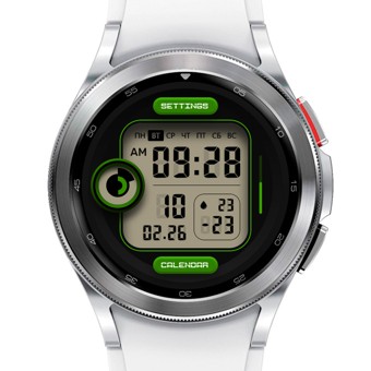 Циферблат имеет дизайн между популярным дизайном 80-х и современным цифровым спорт-минимализмом. Секунды и миллисекунды отображаются шкалами прогресса в отдельном манеже. Индикация часов в форматах 12 и 24 часа. Мигающее двоеточие. Дни недели на русском языке. Время суток (am/pm), число (крупная индикация), месяц, год. Температура воздуха и вероятность осадков в отдельном окошке. Шкала уровня заряда справа сочетается с выбранным цветом циферблата. Десять цветов, четыре тап-зоны (настройки, календарь, параметры пульса и будильник). Экран AOD (с поддержкой выбранного цвета).